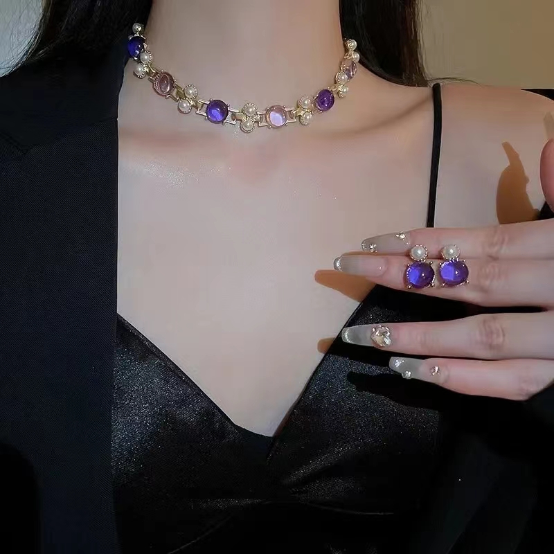 The jewelry set arrived in a small plastic bag. Not very fancy. I opened it up and the first thing I noticed was the color. I got the purple-pink set. It's a really pretty color. The pearls are imitation, of course. They look okay, not super high quality, but decent for the price. The metal parts looked shiny and new. I checked the clasps, and they seemed to work. The earrings were stud earrings with the same faux pearl as the necklace.
